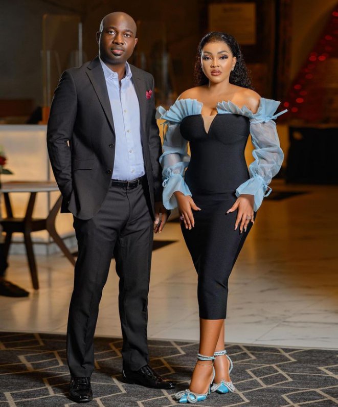 “Actress Mercy Aigbe ties the knot with her Married boyfriend, Marketer Adekaz and also the owner of Ibaka Tv, where she derived the name, D’owner from. Cong……..
